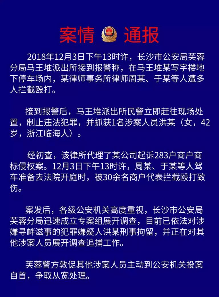 2018年12月3日下午13时许,长沙市公安局芙蓉分局马王堆派出所接到报警称,在马王堆某写字楼地下停车场内,某律师事务所律师周某、于某等人遭多人拦截殴打。